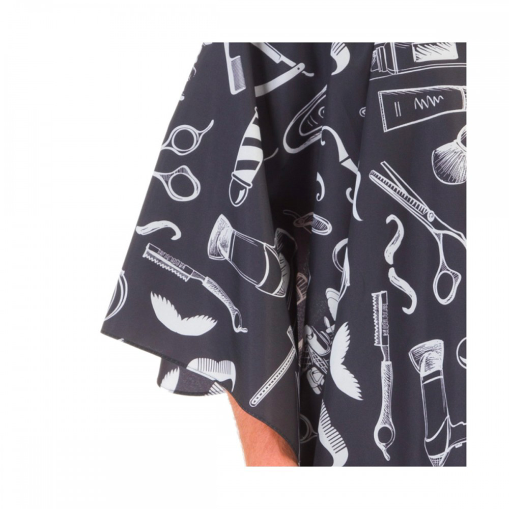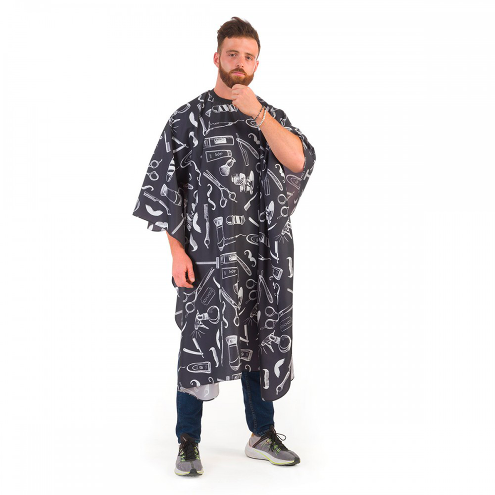 Mantella uomo da salone parrucchieri e barbieri per il taglio dei capelli e barba. Realizzata in tessuto morbido, impermeabile e resistente, con bordo rifinito a orlo ribattuto. Il collo della mantella è elastico e si regola con dei pratici ganci in metallo. La mantella è di grandi dimensioni e copre perfettamente gli abiti durante il taglio dei capelli.
